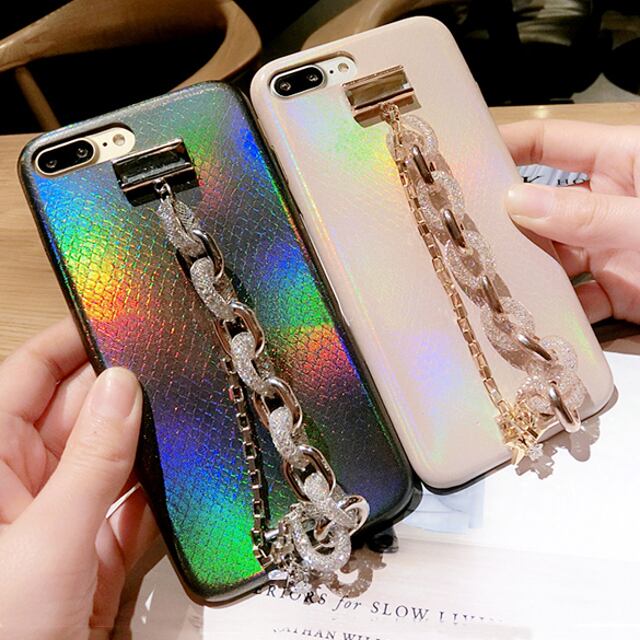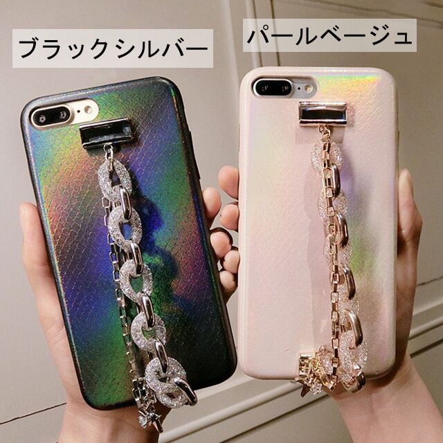 偏光ホログラムのケースにオシャレなブレスレットチェーンがついたシェル型(背面保護タイプ)iPhoneケースです♪