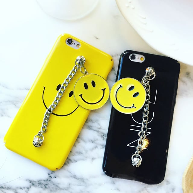 スマイル マーク NICE チャーム 付き チェーン iPhone シェルカバー ケース ( ブラック イエロー ) ★ iPhone 6 / 6s / 6Plus / 6sPlus / 7 / 7Plus / 8 / 8Plus ★ [NW136]