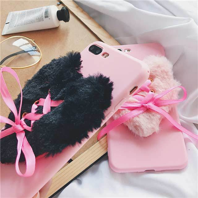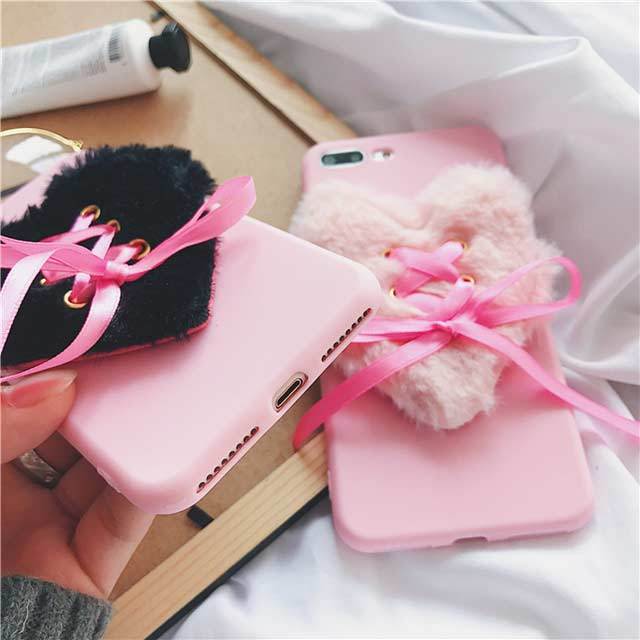 ハート ファー 編み上げ 可愛い iPhone シェルカバー ケース 個性的 立体的 SNS映え ブラック ピンク ★ iPhone 6 / 6s / 6Plus / 6sPlus / 7 / 7Plus / 8 / 8Plus ★ [MD018]