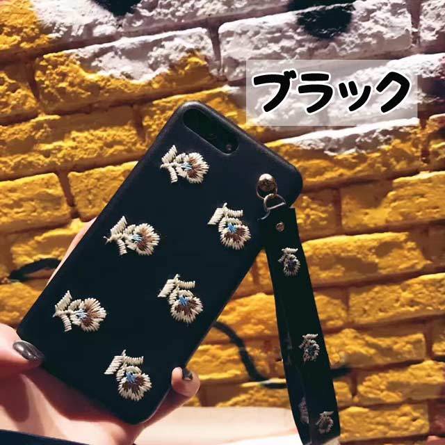 花 刺繍 レザー調 ストラップ iPhone シェルカバーケース ( ブラック ピンク ブルー ) 可愛い シンプル お揃い ★ iPhone 6 / 6s / 6Plus / 6sPlus / 7 / 7Plus / 8 / 8Plus ★ [MD042]