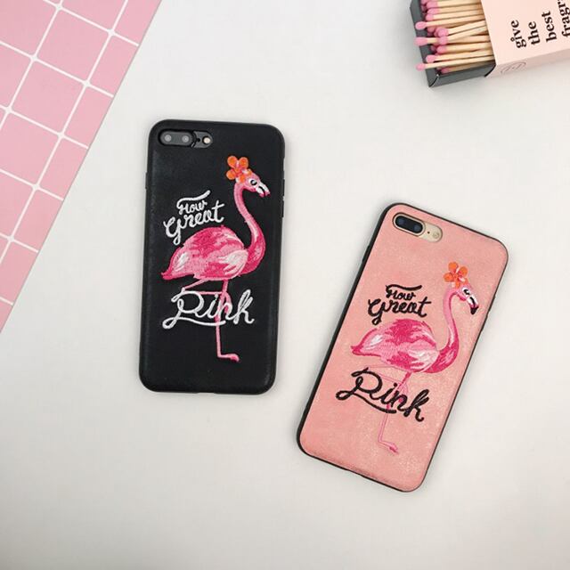 フラミンゴ 刺繍 おしゃれ iPhone シェルカバー ケース ( ブラック ピンク ) ★ iPhone 6 / 6s / 6Plus / 6sPlus / 7 / 7Plus / 8 / 8Plus / X ★ [NW484]