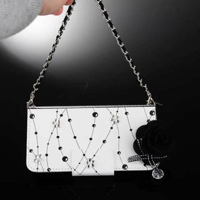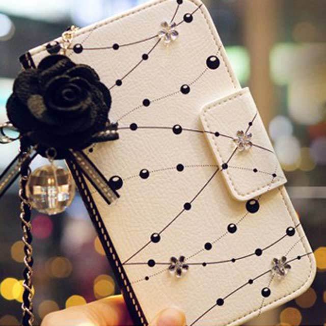 モノトーン ビジュー 可愛い iPhone 手帳型 ケース 大人 バッグ型 ストラップ オトナ 花 ★ iPhone SE / 5 / 5s / 6 / 6s / 6Plus / 6sPlus / 7 / 7Plus / 8 / 8Plus ★ [MD105]