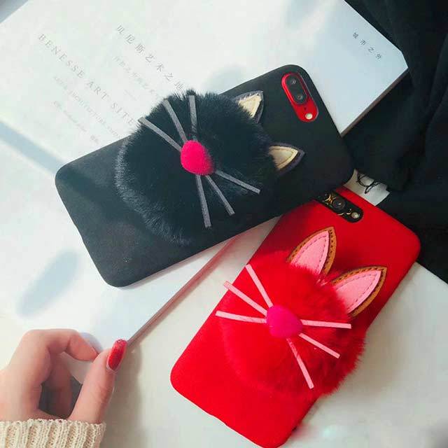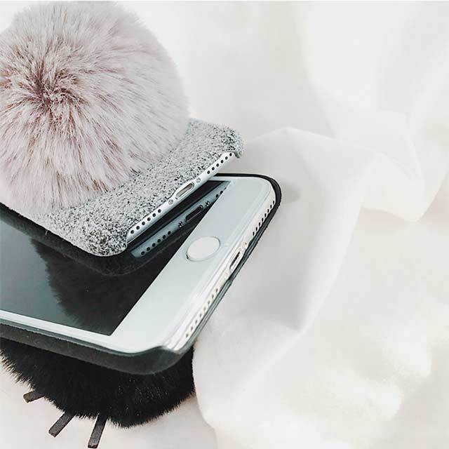 ネコ ファー 可愛い iPhone シェルカバー ケース ブラック グレー レッド ピンク ポンポン ★ iPhone 6 / 6s / 6Plus / 6sPlus / 7 / 7Plus / 8 / 8Plus / X ★ [MD111]